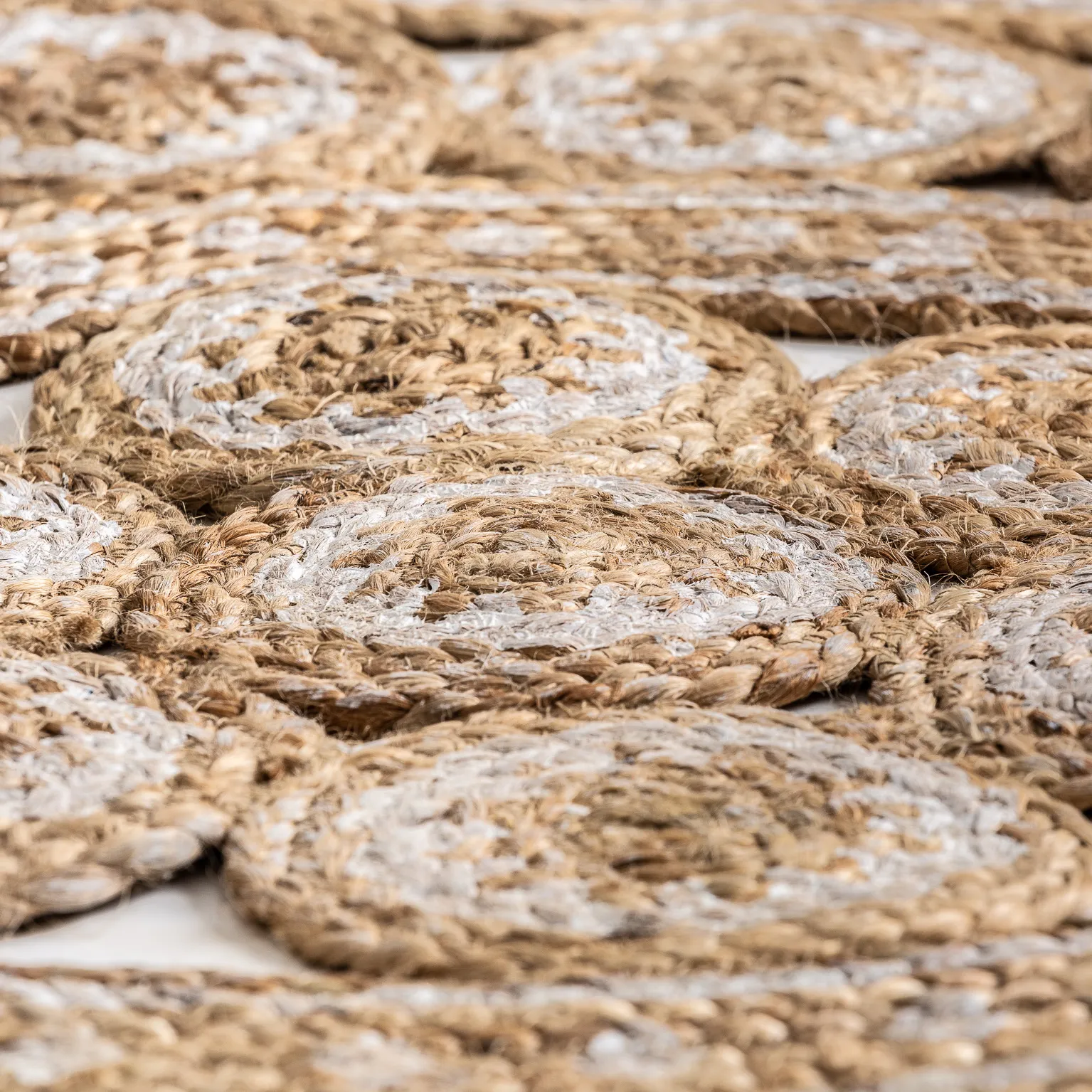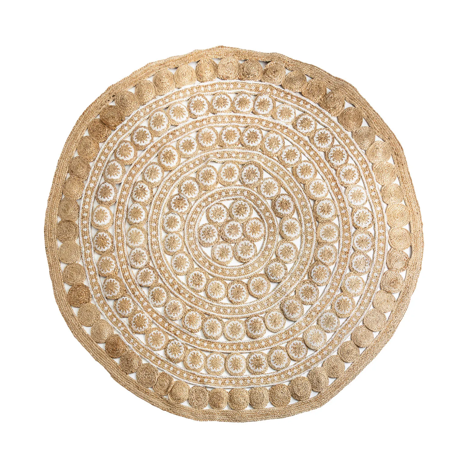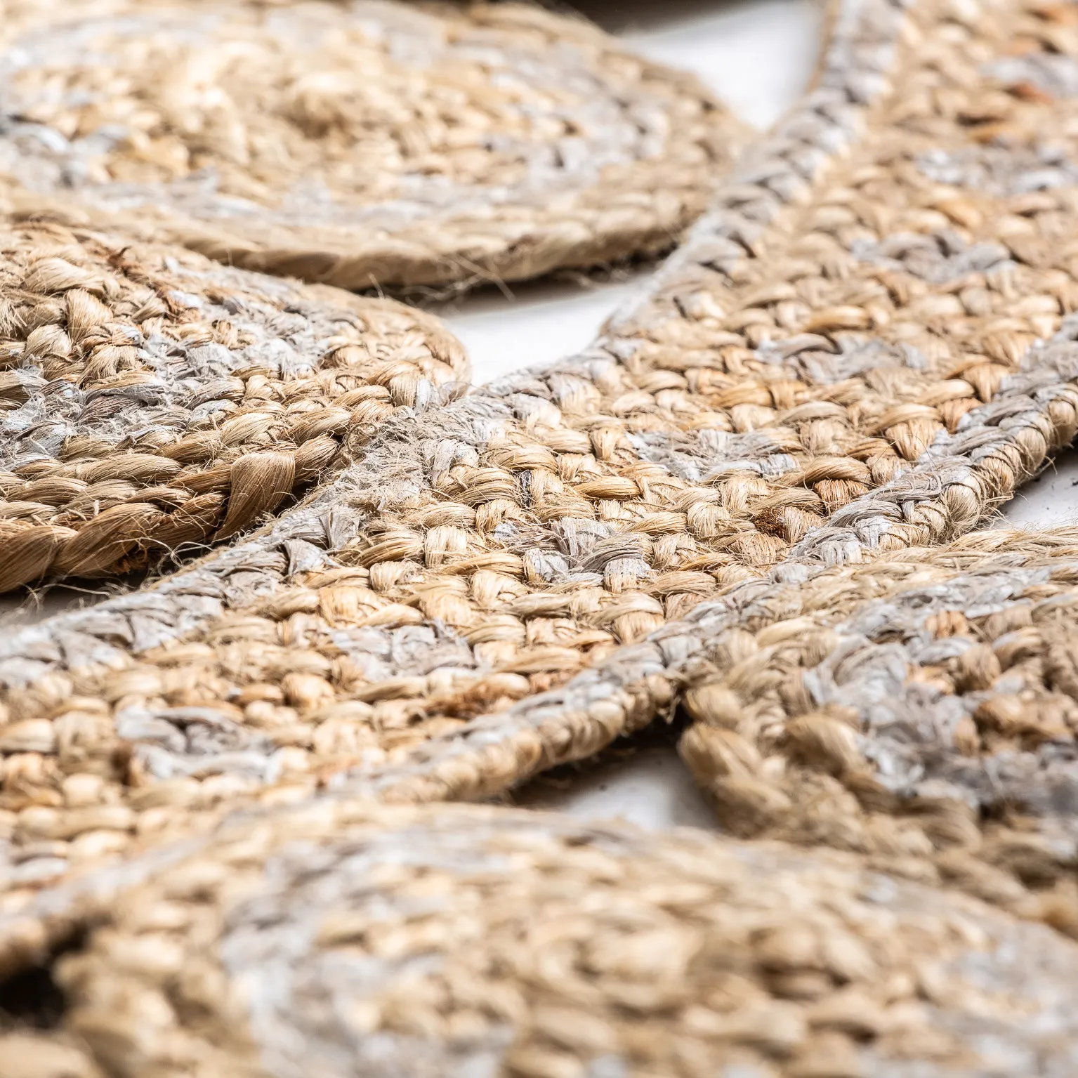 Alfombra Zulai de estilo étnico, fabricado en cáñamo en color arena, combinado con yute.