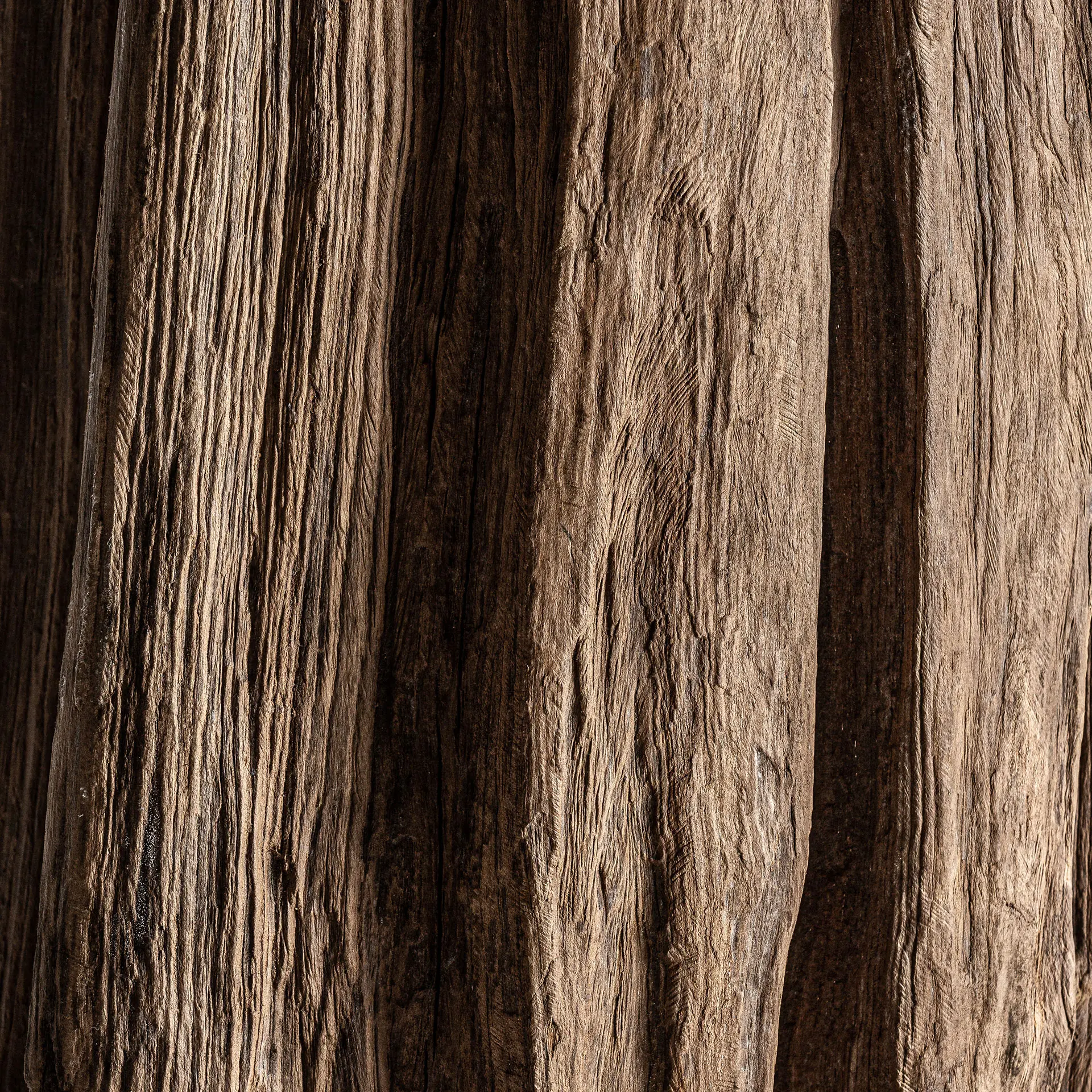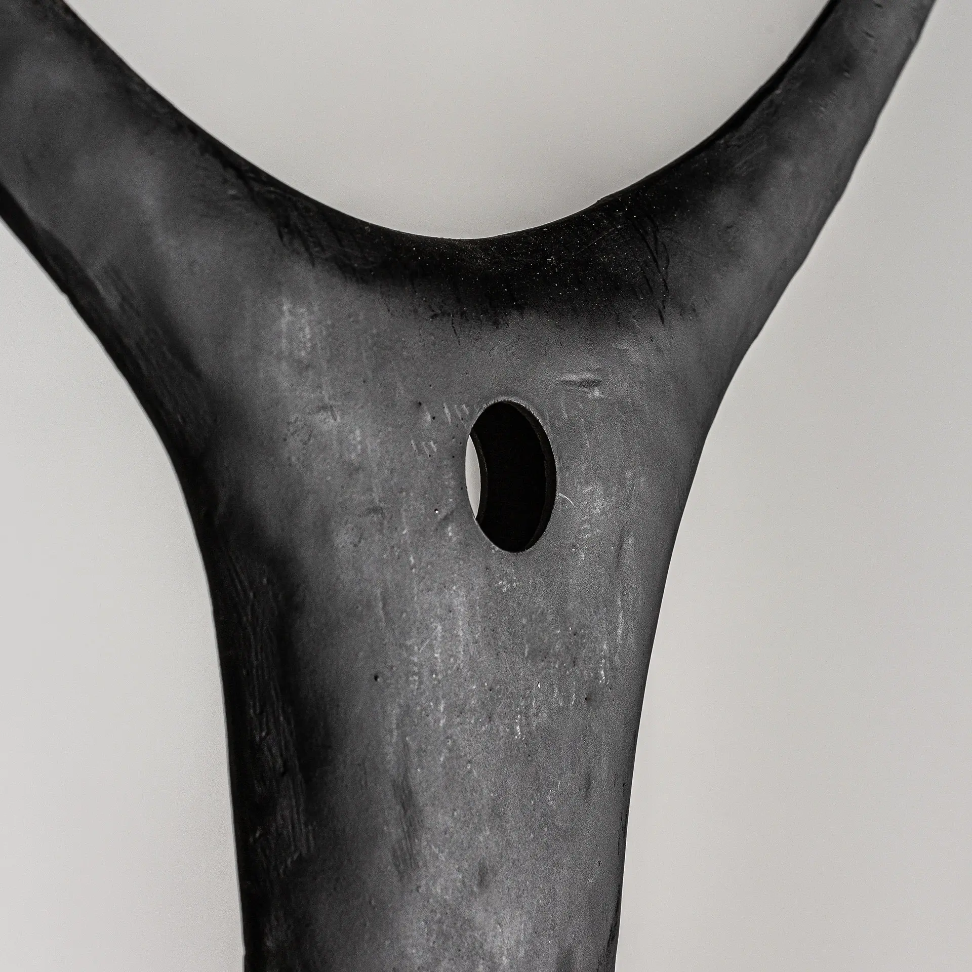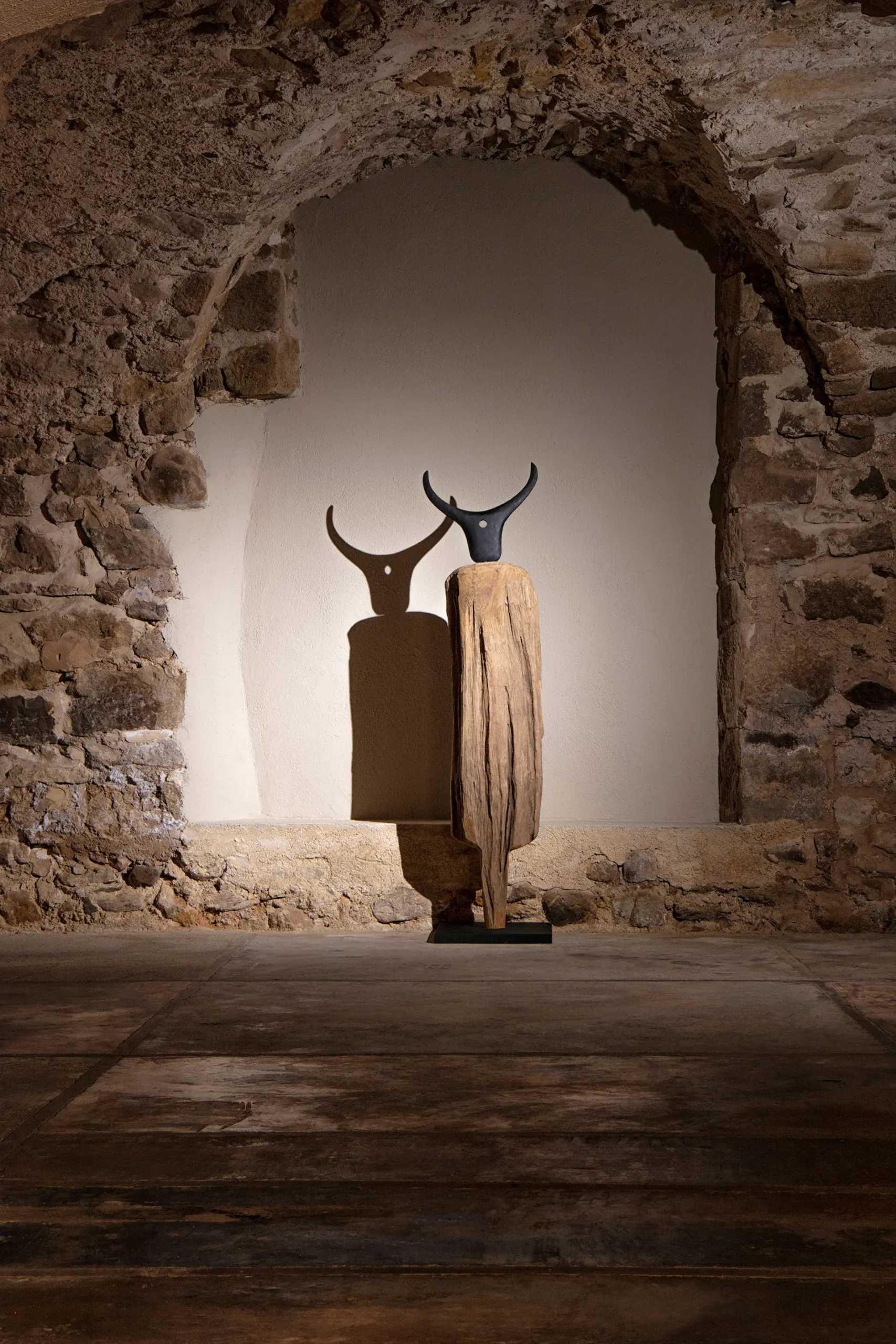 La escultura, en madera tropical negra con detalles metálicos, destaca por su diseño sobrio y su presencia escultórica. VICAL firma esta pieza con su sello inconfundible.