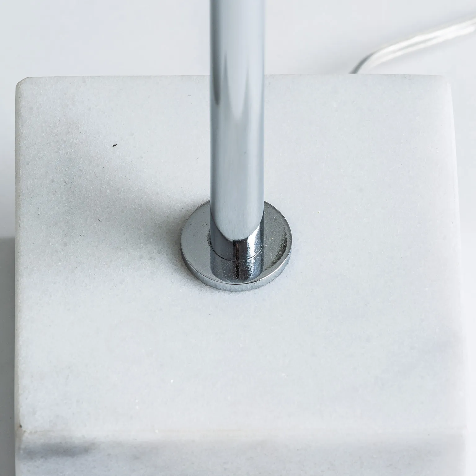 Lámpara de sobremesa Gershem de estilo art deco, fabricado en hierro en color blanco, combinado con mármol en color plata y vidrio en color blanco. Producto desmontable.