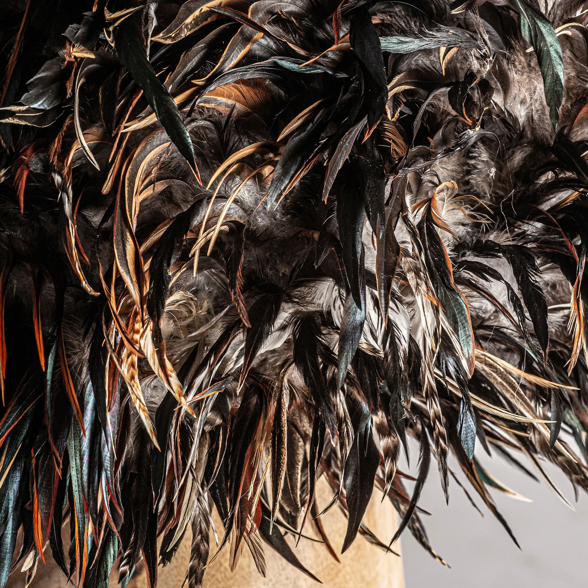 Lámpara de sobremesa Ghedas de estilo étnico, fabricado en madera de teka en color marrón claro con acabado envejecido, combinado con plumas en color marrón. Producto elevable.