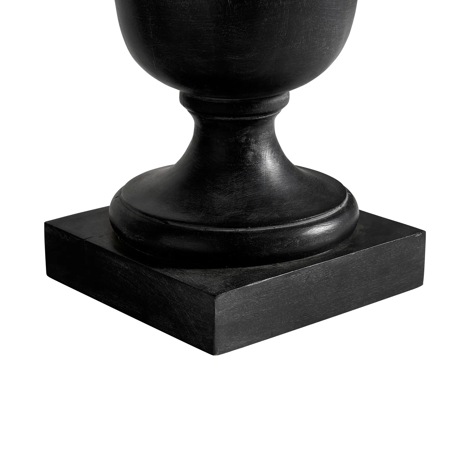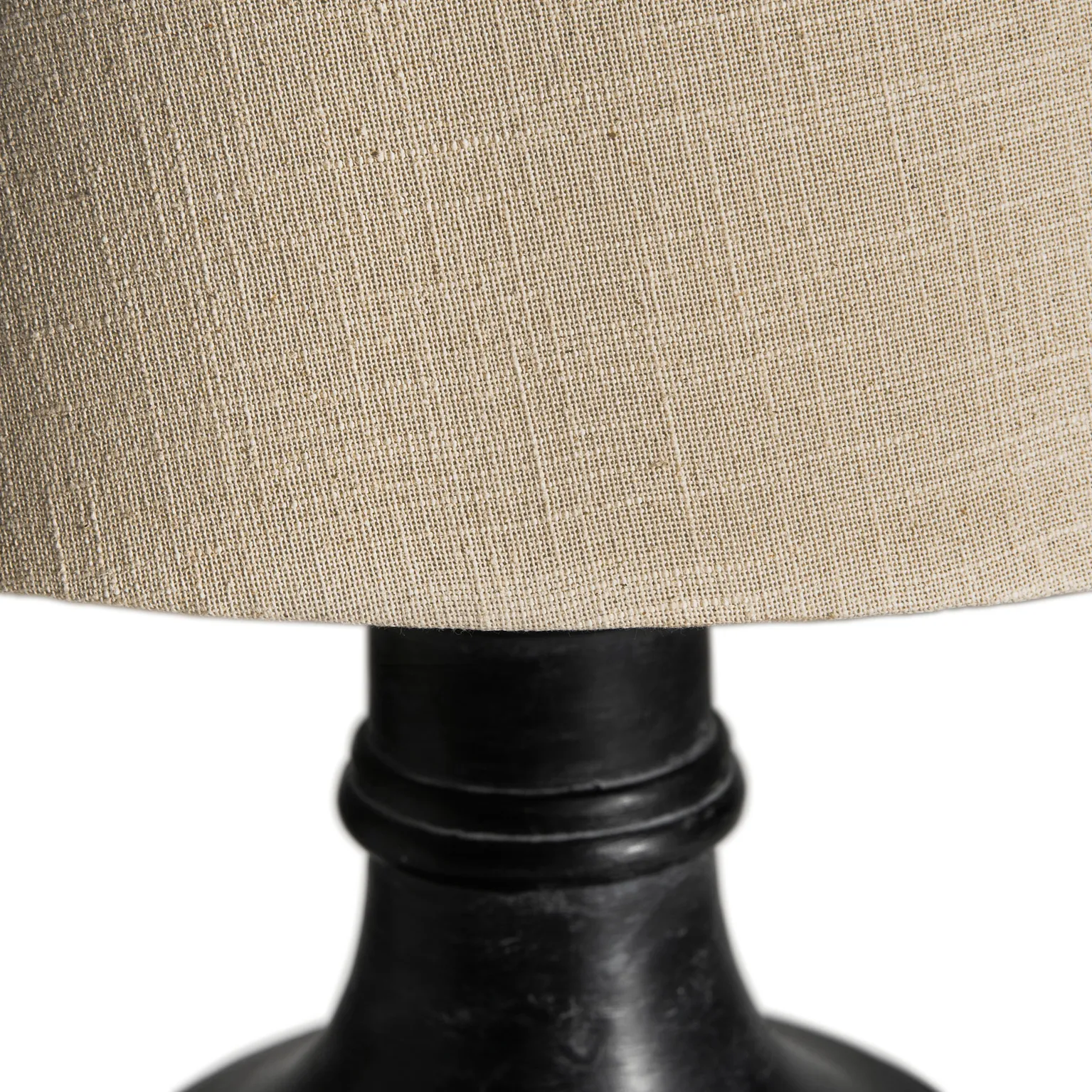 Lámpara de sobremesa Reinha de estilo provenzal, fabricado en madera de mango en color negro con acabado decapado, combinado con algodón.